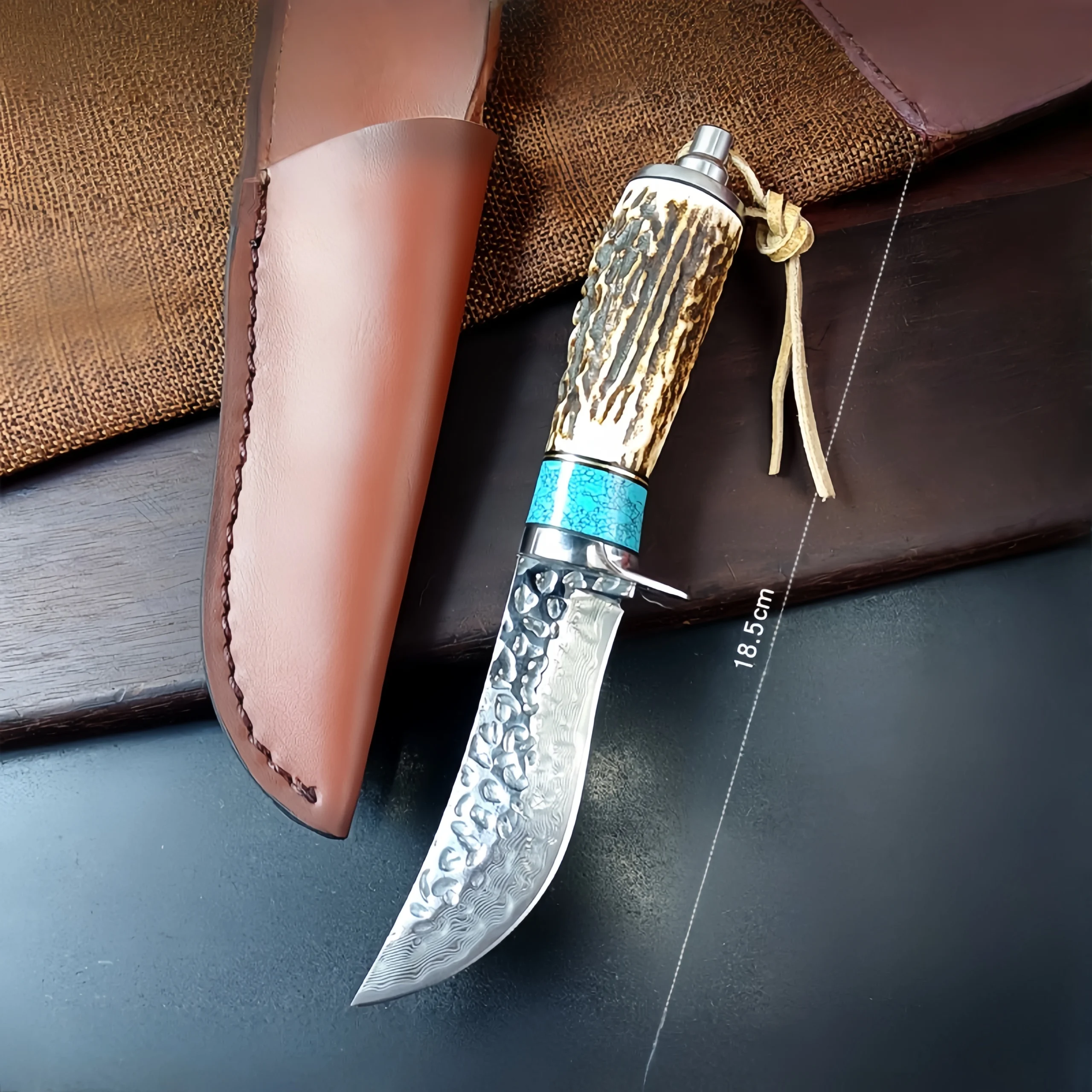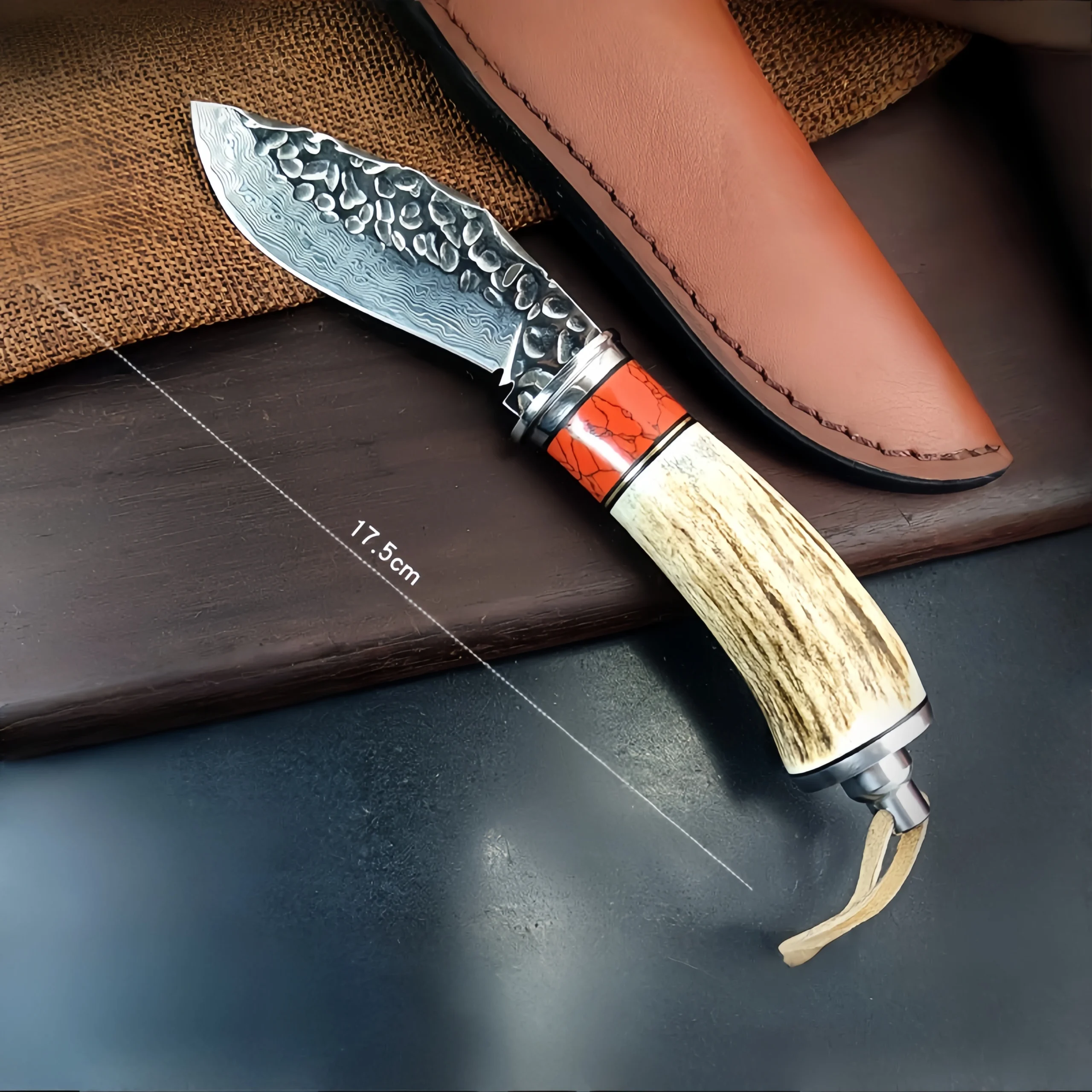 Damascus forged steel camping small straight knife antler handle knife