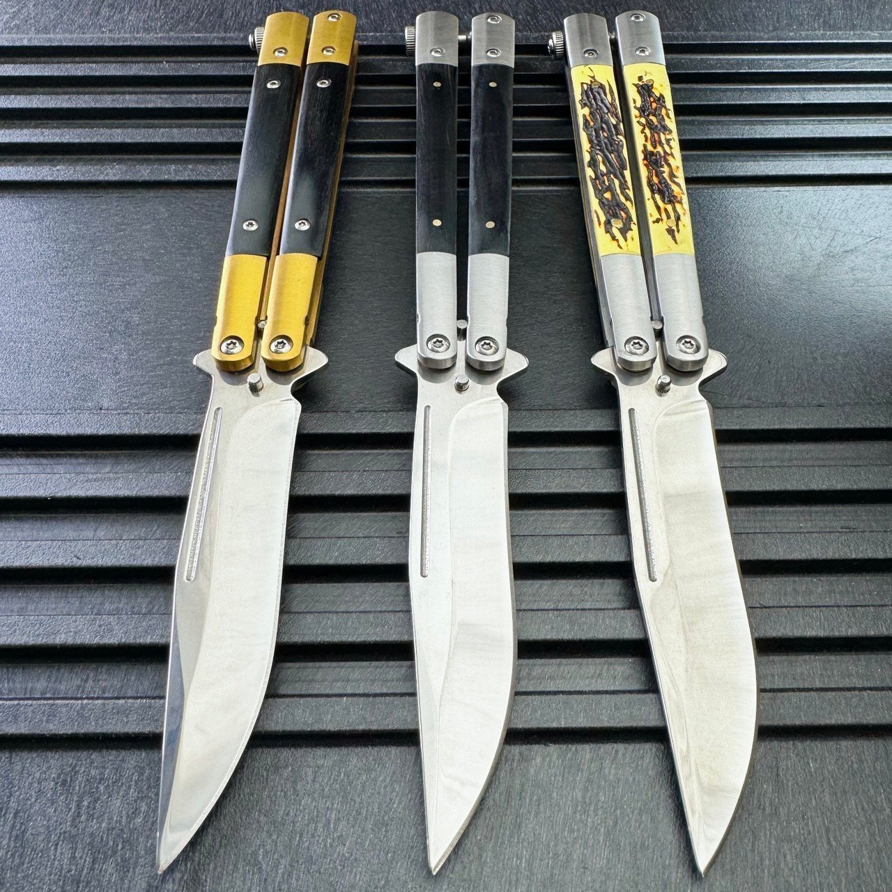 Dieses Butterflymesser verfügt über Aluminiumgriffe mit einer wunderschönen Einlage aus Holz oder Hirschhornimitat. Die Clip-Point-Klinge aus 440C-Edelstahl ist robust und rostfrei und garantiert so eine lange Lebensdauer. Das Messer ist mit einer Verriegelung am linken Griff ausgestattet. Schließen Sie das Messer einfach und schieben Sie die Verriegelung in den rechten Griff. Das Messer bleibt geschlossen.